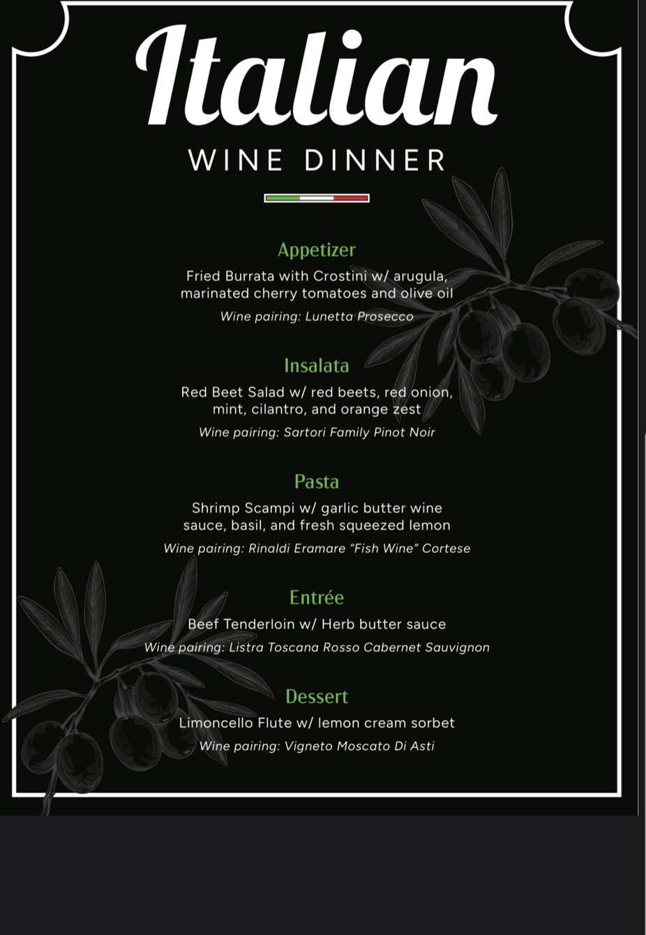 5 Course dinner paired with a variety of Italian & Sicilian wine.